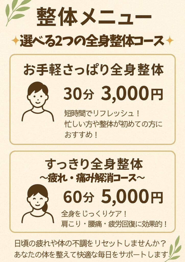 現在(2025年11月1日)羽ばたき整体院では30分と60分の全身整体メニューがあります😊